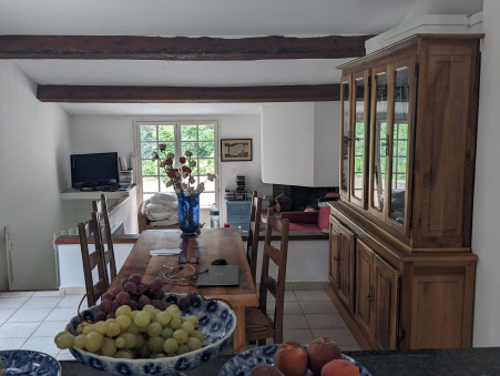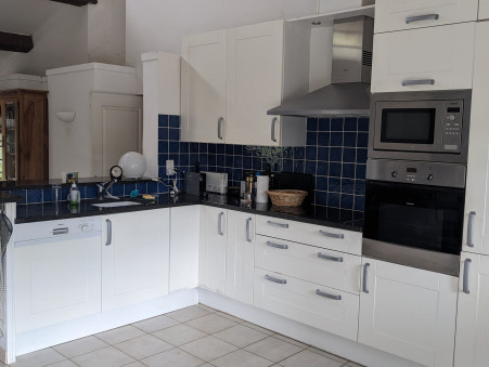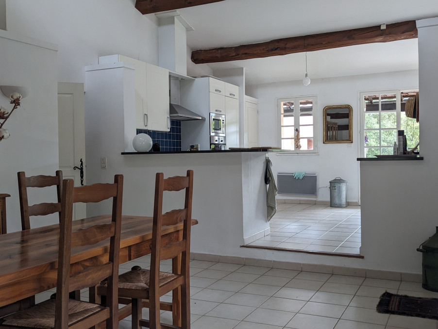 - en rez-de-chaussée : grande cuisine américaine entièrement équipée avec espace salle à manger (21 m2), double séjour (34 m2) avec cheminée, 1 chambre (15.5 m2) avec terrasse, 1 WC indépendant et une grande salle de bains (8 m2). La cuisine ouvre sur une belle terrasse côté Sud et Ouest avec espace bbq.
